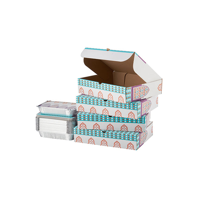 The aluminium containers are ideal for holding hot and cold dishes securely, while the hinged, openable corrugated meal boxes ensure safe transportation and an attractive presentation. With elegant Ramadan designs, this combo enhances your brand image and creates a memorable unboxing experience for customers during the holy month.
